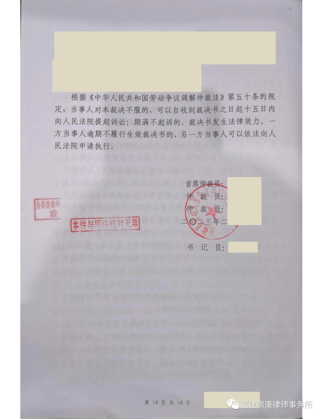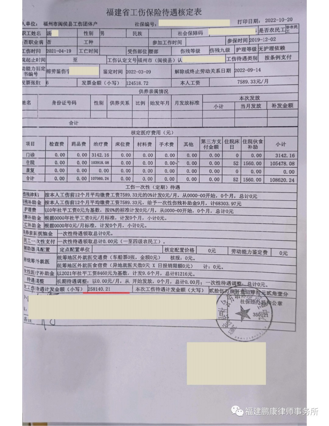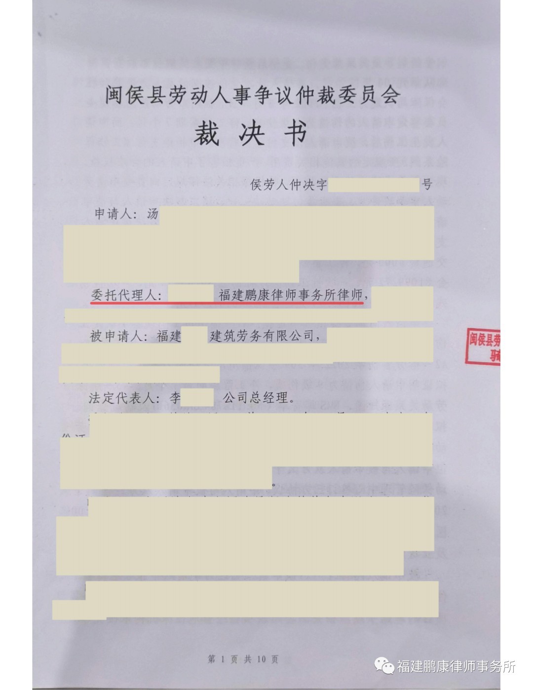 经过本所律师代理该案,闽侯县劳动人事争议仲裁委员会最终裁决公司赔偿132238.1元,闽侯县社会劳动保险管理中心支付258140.21,委托人共获赔偿390378.31元。