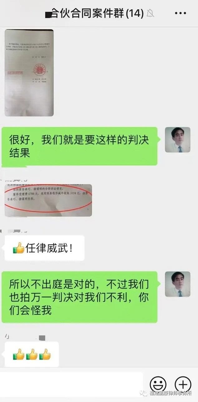 任律师接手该案后,建议委托人吴某变被动为主动,利用其系工商登记的门店负责人身份剥离原有双方的业务,使吴某的财务与实际管理权重新回归。双方的地位反转后,徐某等人便多次求助相关政府部门,仍然无法扭转其被动的经营管理地位,最后徐某等人便以吴某侵害财产权为由向法院提起合伙合同赔偿之诉。徐某等人起诉后,任律师考虑到案件事实的认定与法官的裁判思路,经过任律师与团队其他律师的反复研究与权衡利弊后,建议吴某不出庭为宜,一来可以尽量减少裁判的不利因素,二来还可以节省本次诉讼的律师费成本,委托人吴某采纳了团队律师的办案思路。
