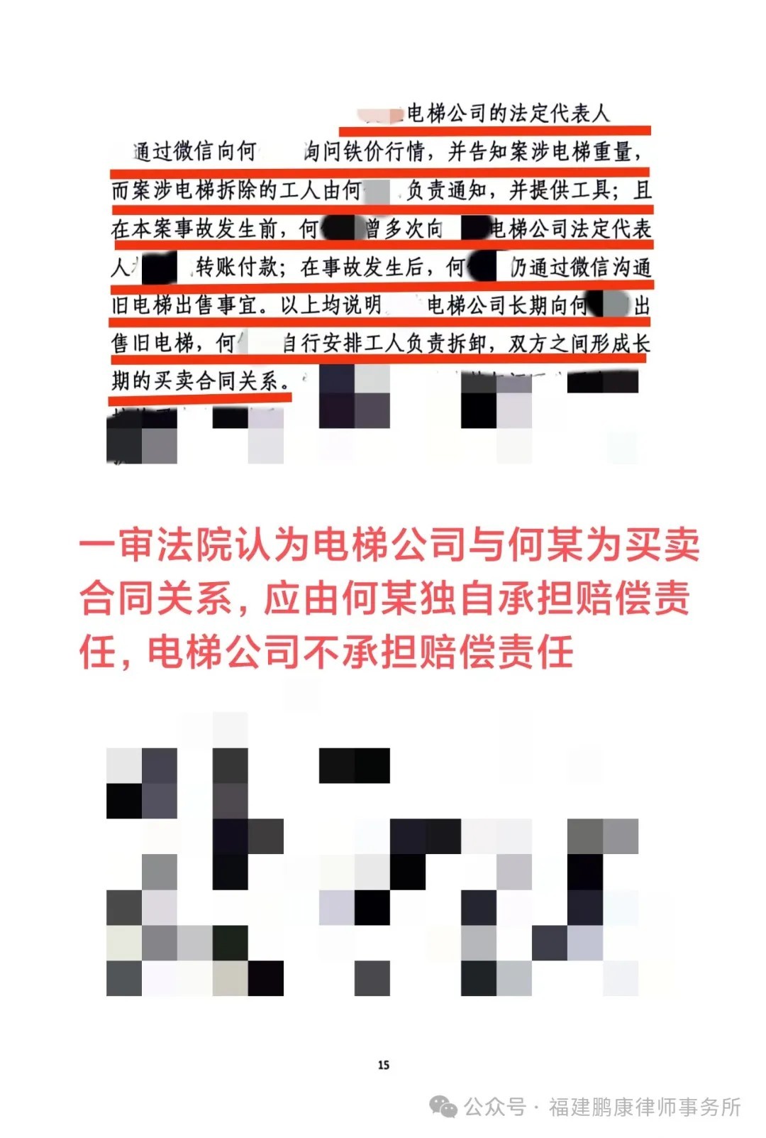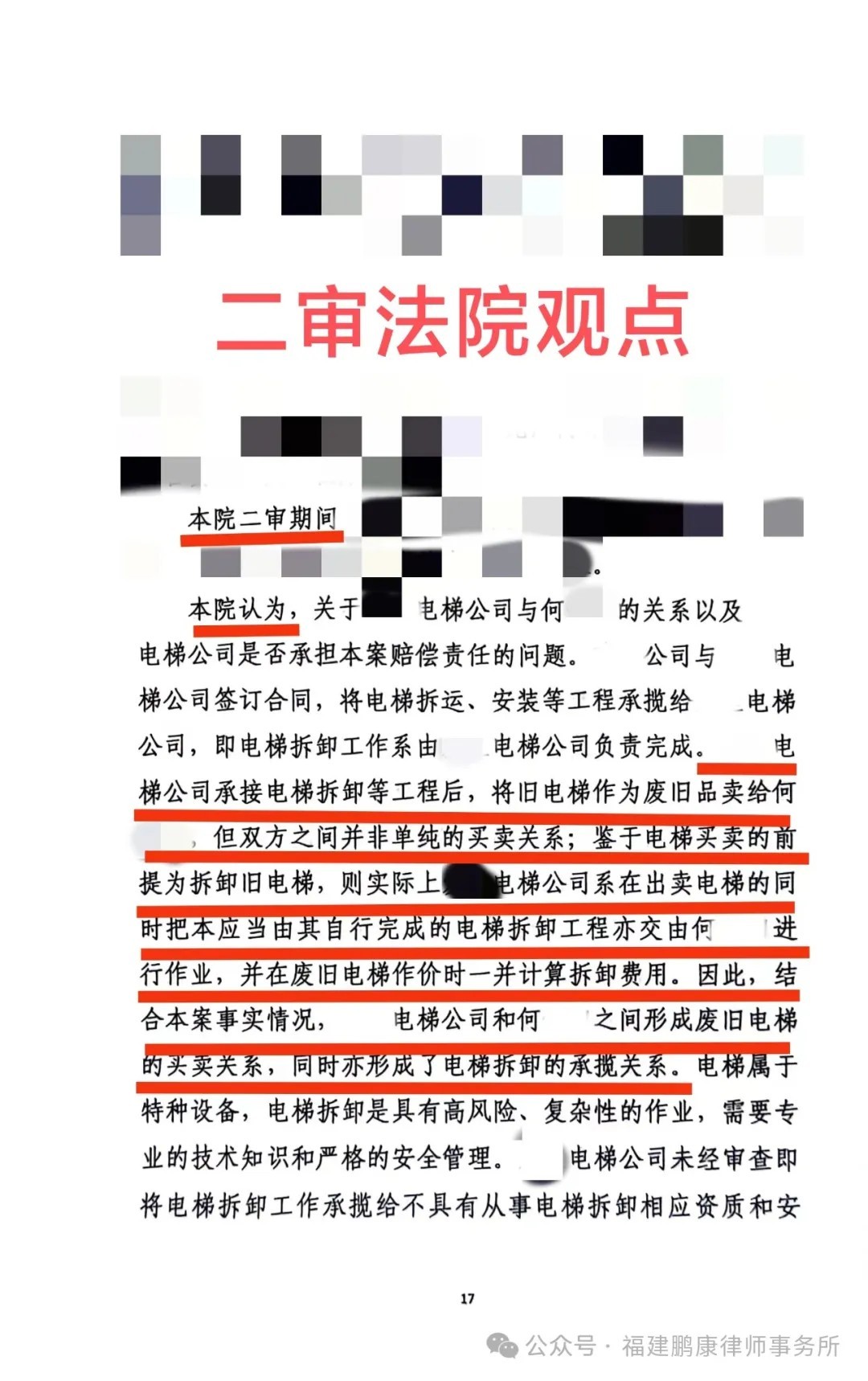 本所律师研究本案后认为,电梯公司与何某之间并不是单纯的废旧电梯买卖合同关系,而是电梯公司将本应自行完成的电梯拆卸工作交给何某负责,只是在废旧电梯售卖作价时一并计算拆卸费用给何某。同时,电梯属于特种设备,电梯拆卸是具有高风险、复杂性的作业,需要专业的技术知识和严格的安全管理,但何某并不具备从事电梯拆卸相应资质和安全生产条件,所以电梯公司具有过错也应承担赔偿责任。本所律师以此上诉方案全面展开二审的代理工作,争取让有赔偿能力的电梯公司承担赔偿责任。