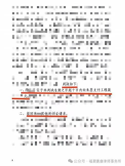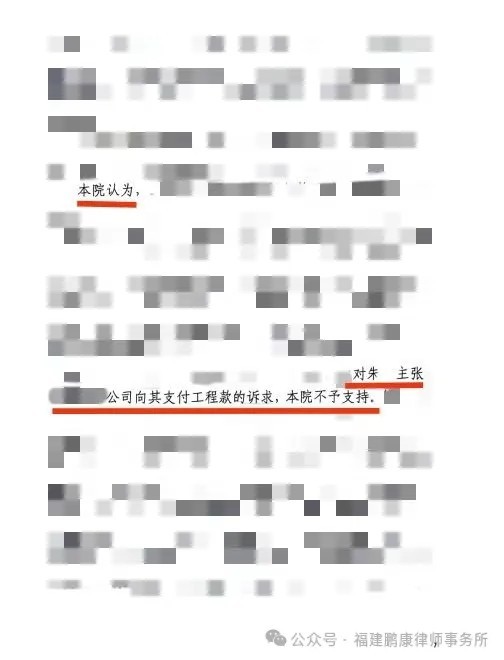 在本所律师的精心准备和争取下,法院采纳了我们的代理意见,最终判决驳回朱某对委托人某建筑公司的诉讼请求,委托人某建筑公司对此不承担付款责任。