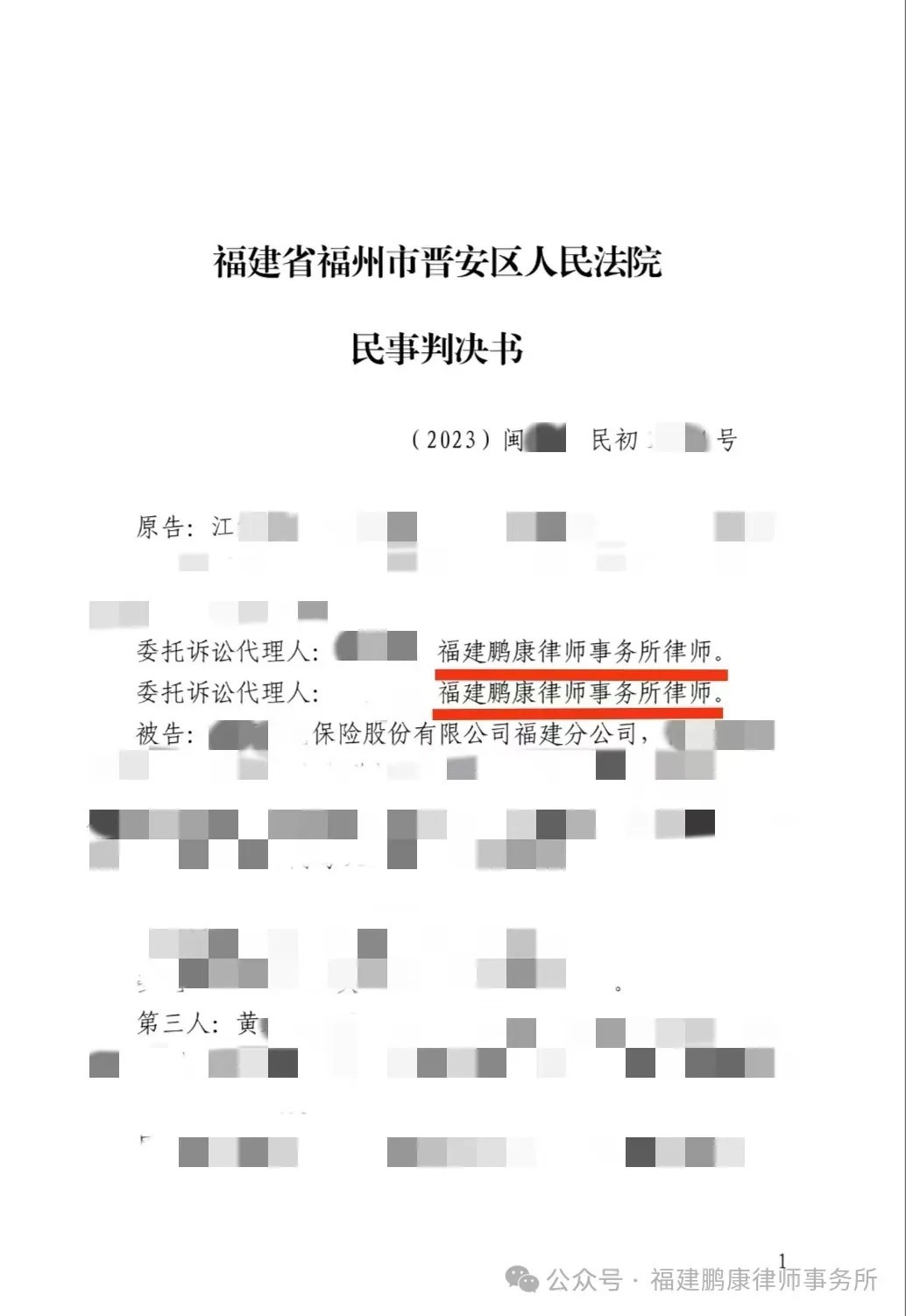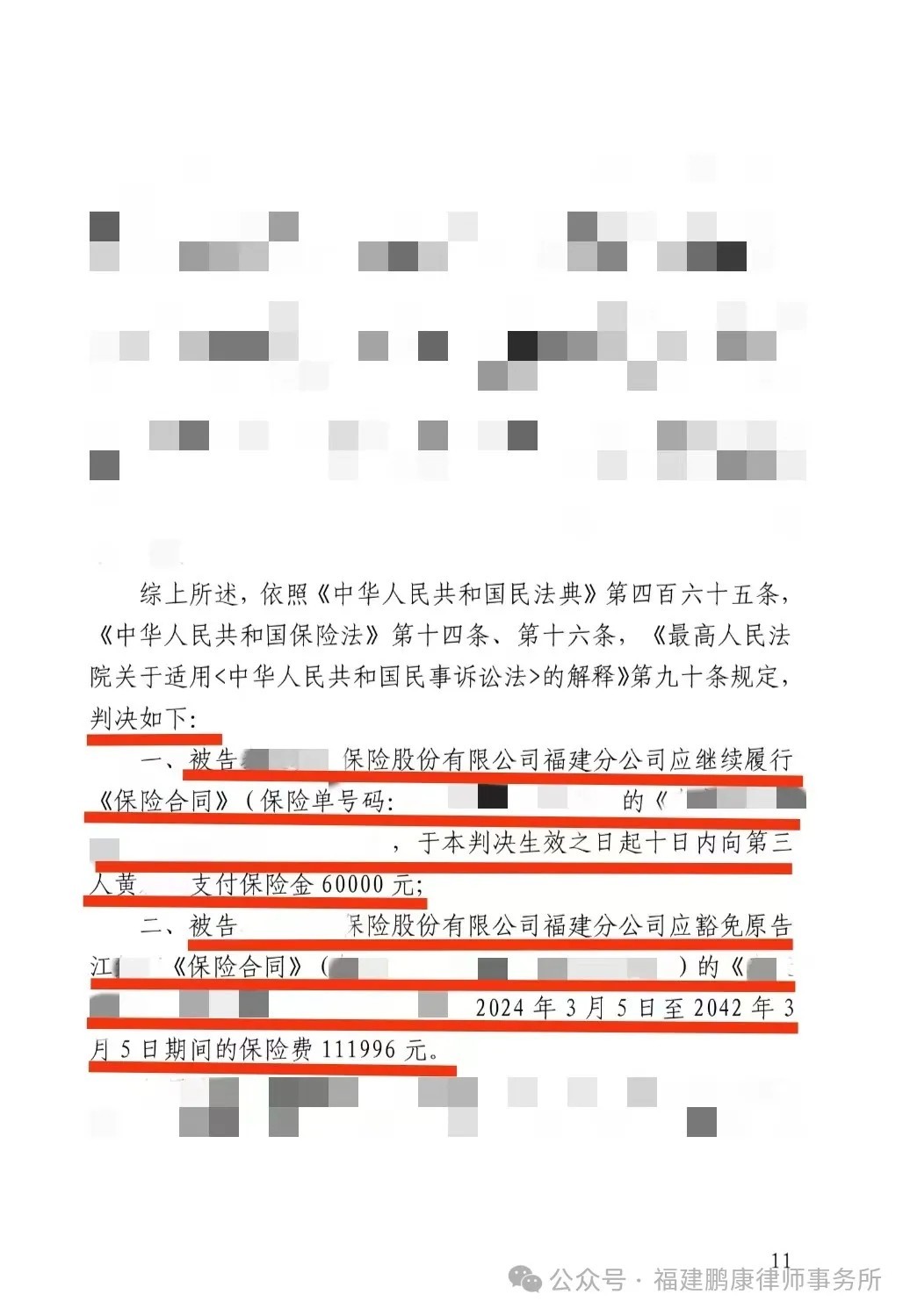 最终福州市晋安区人民法院采纳本所律师意见,判决保险公司向黄某支付保险金,并豁免后期所有保险费。
