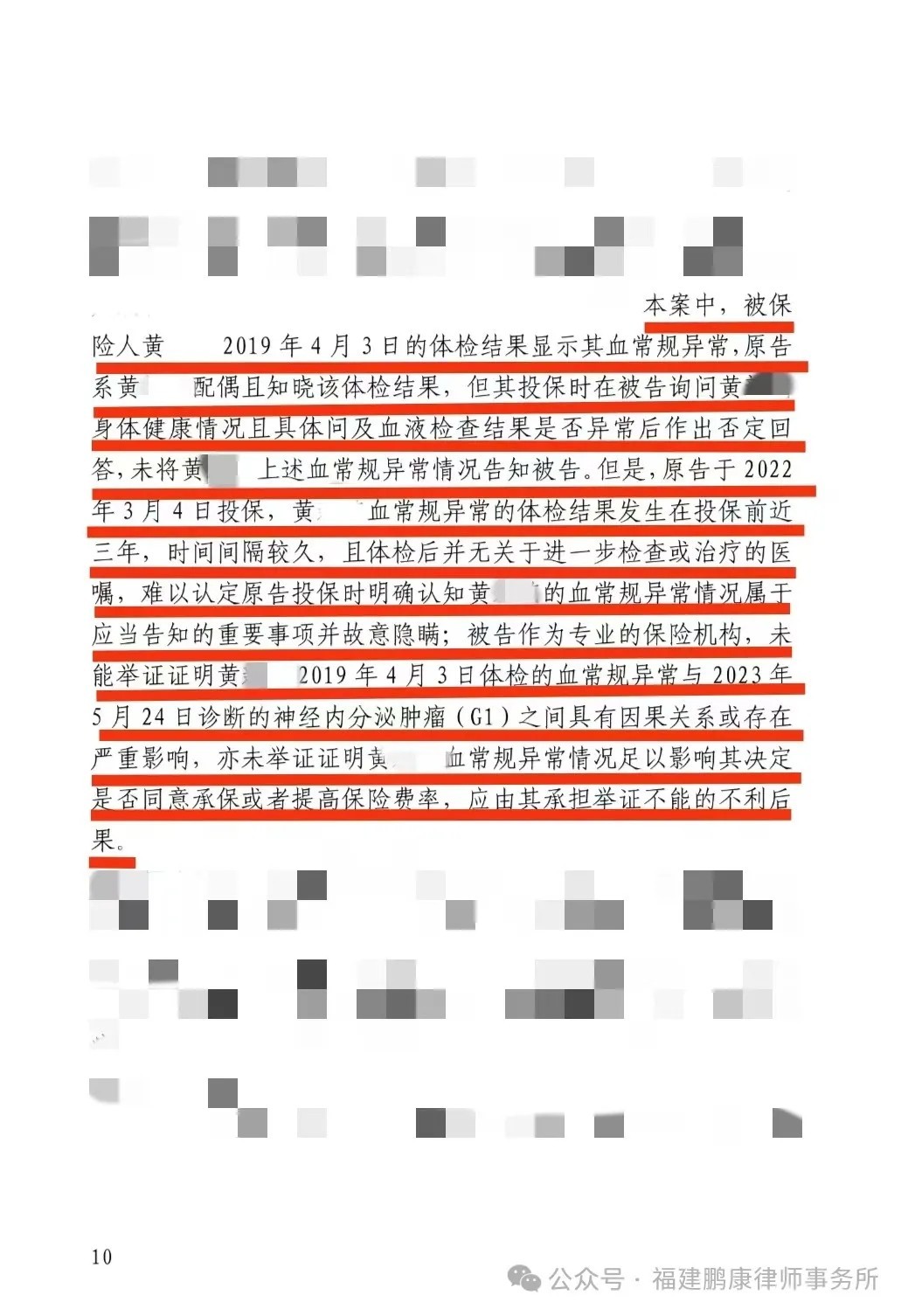 本所律师围绕上述办案思路进行代理,法院经审理认为:1.委托人于2022年3月投保,而血常规异常体检报告系2019年4月作出,时间间隔近三年之久,且体检后并无关于进一步检查或治疗的医嘱,所以黄某检查出来的血常规异常不属于保险条款所约定的应当告知的重要事项故意隐瞒并未如实告知的情况。2.保险公司作为专业的保险机构,未能举证证明黄某2019年4月3日体检的血常规异常与2023年5月24日诊断的疾病之间具有因果关系或存在严重影响。3.保险公司亦未举证证明黄某血常规异常情况足以影响其决定是否同意承保或者提高保险费率,应由其承担举证不能的不利后果。所以保险公司单方面解除合同行为不符合法律规定,应按合同约定进行理赔。