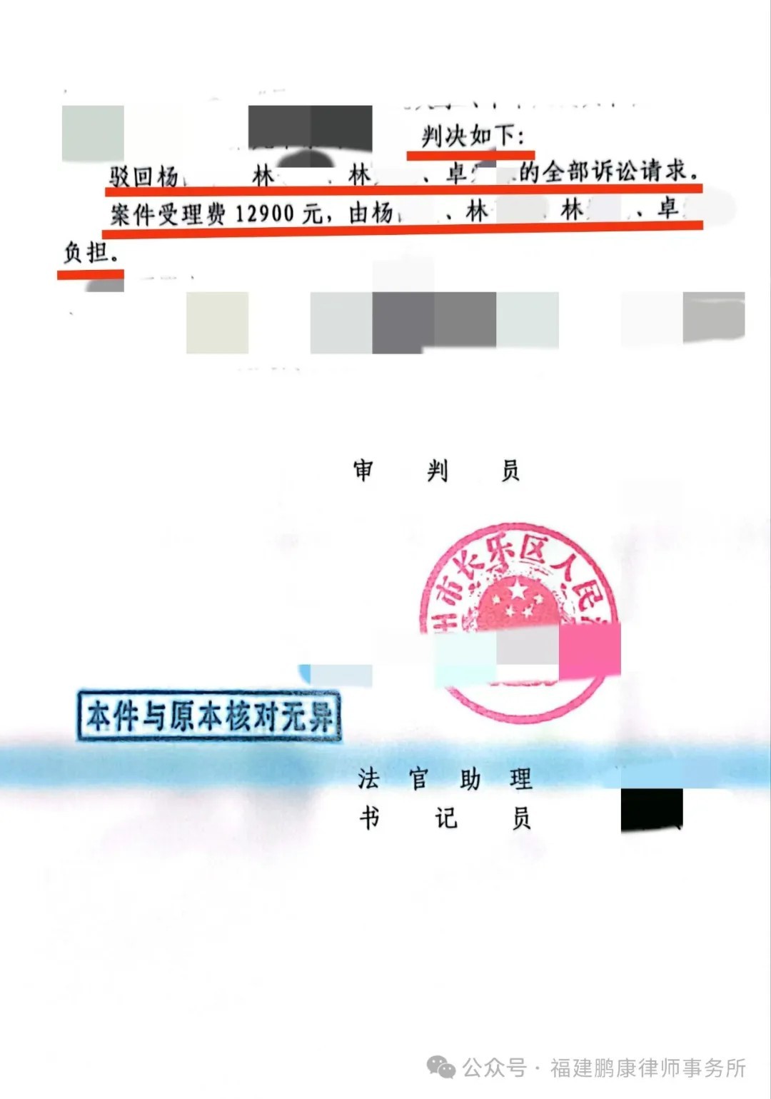经过法庭审理,本所律师成功打破原告杨某等人的证据链条,法院最终采纳本所律师的全部观点,驳回了原告杨某等人全部诉讼请求。