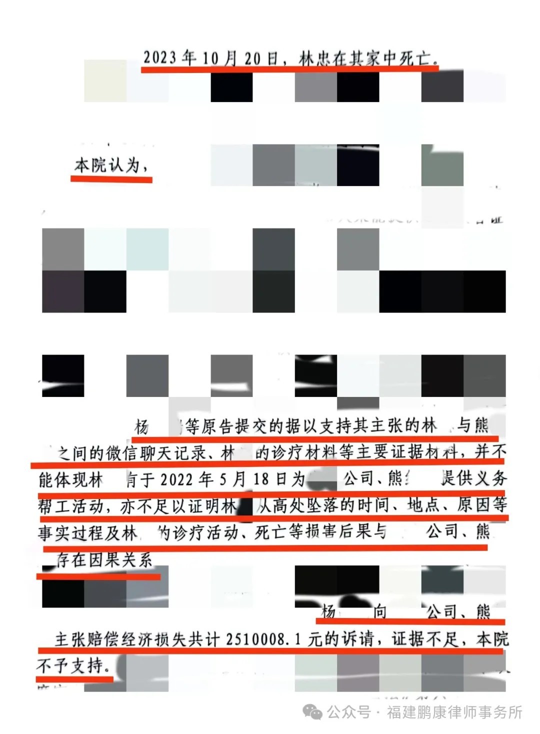 2024年7月,原告杨某等人称因其近亲属林某为委托人某纺织公司提供义务帮工不慎摔伤经治疗后死亡,为此原告杨某等人起诉至法院,要求委托人某纺织公司赔偿200余万元,委托人某纺织公司向本所寻求帮助,本所受理后,指派劳动与侵权事务部律师承办本案。