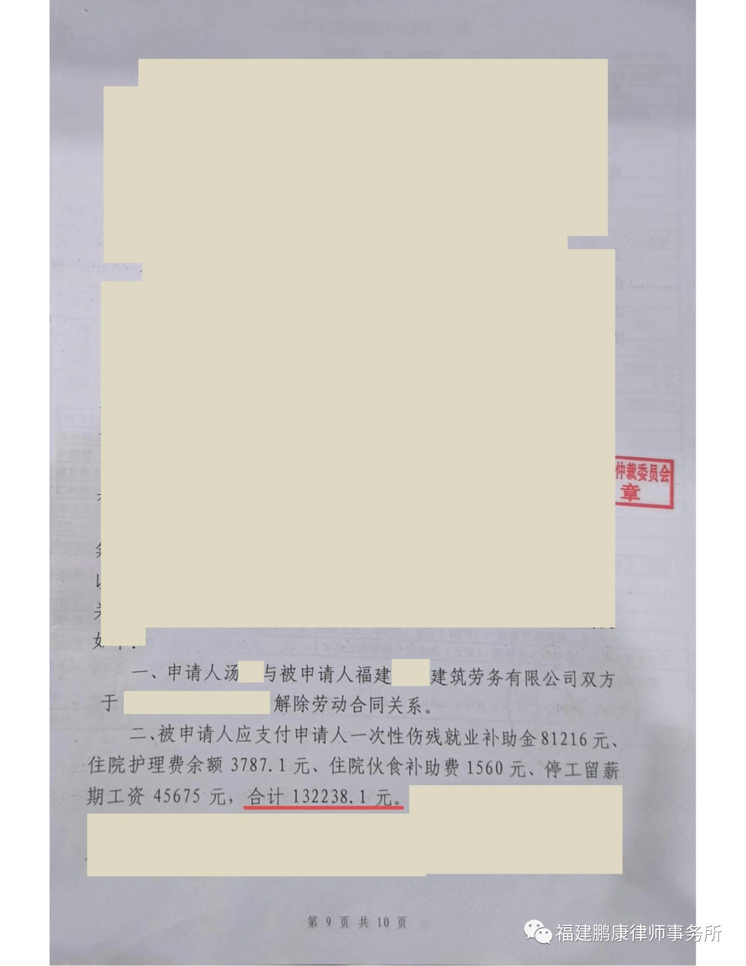 经过本所律师代理该案,闽侯县劳动人事争议仲裁委员会最终裁决公司赔偿132238.1元,闽侯县社会劳动保险管理中心支付258140.21,委托人共获赔偿390378.31元。