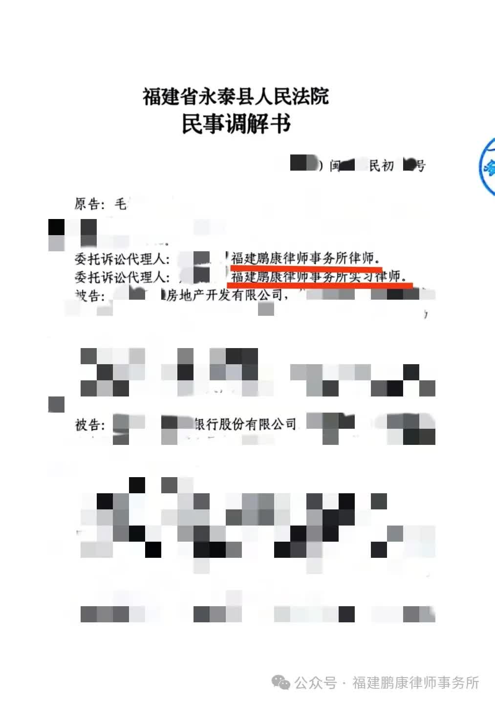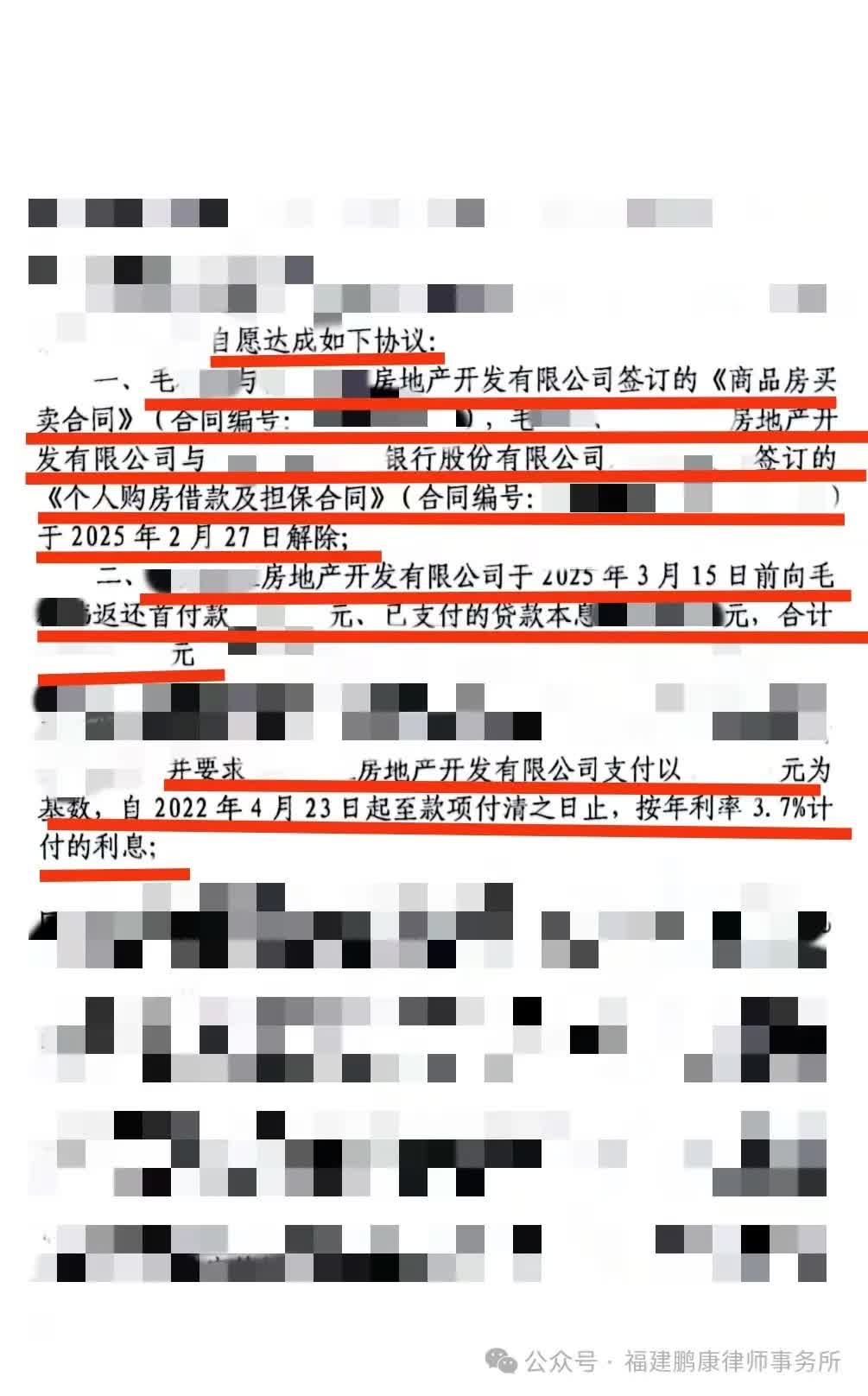 在本所律师的努力下,委托人最终与开发商、银行达成调解,成功解除了《商品房买卖合同》和《个人购房借款及担保合同》,并由开发商向委托人返还首付款和月供等相关款项。