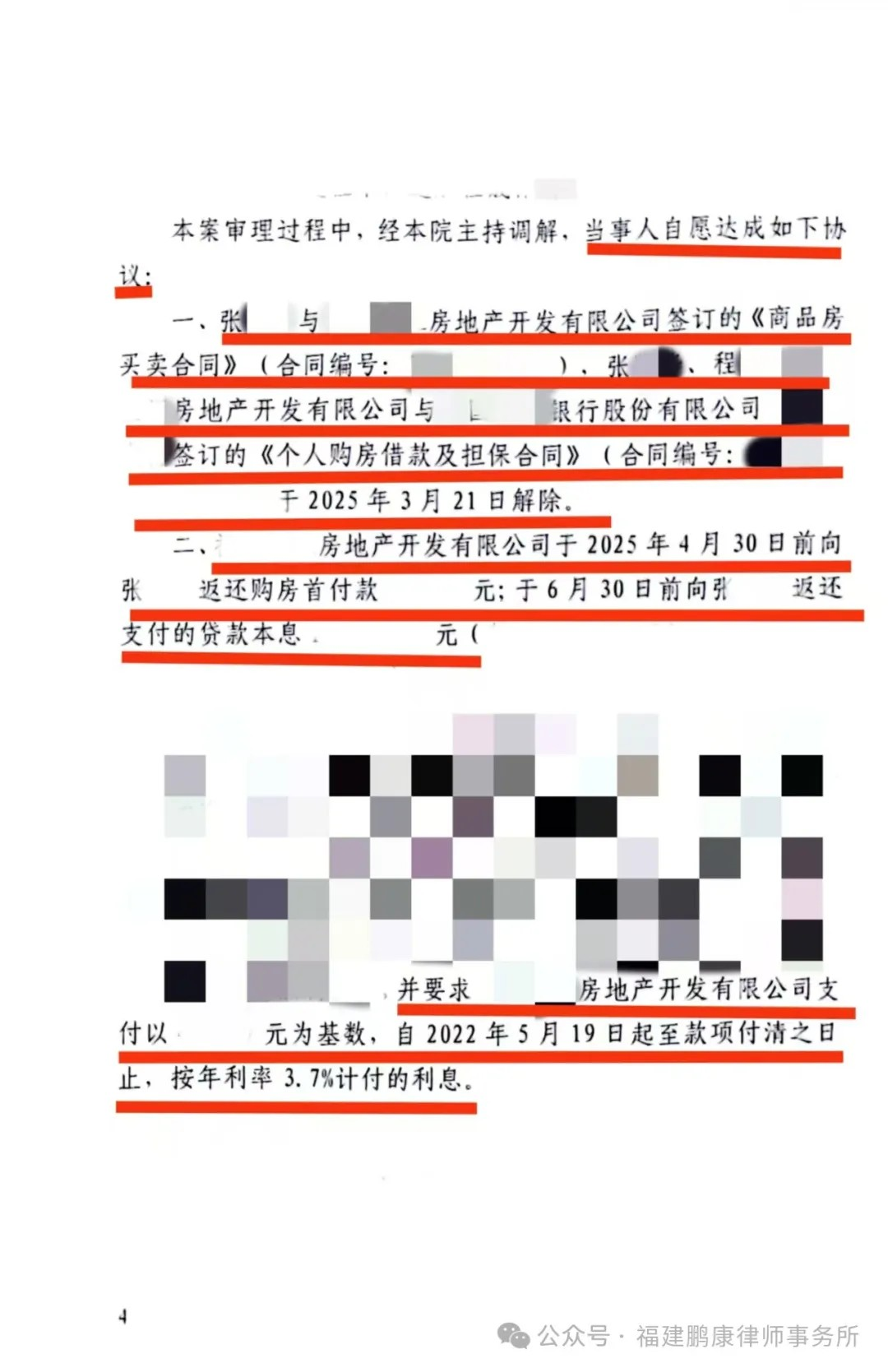 在本所律师的努力下,委托人最终与开发商、银行达成调解,成功解除了《商品房买卖合同》和《个人购房借款及担保合同》,并由开发商向委托人返还首付款和月供等相关款项。
